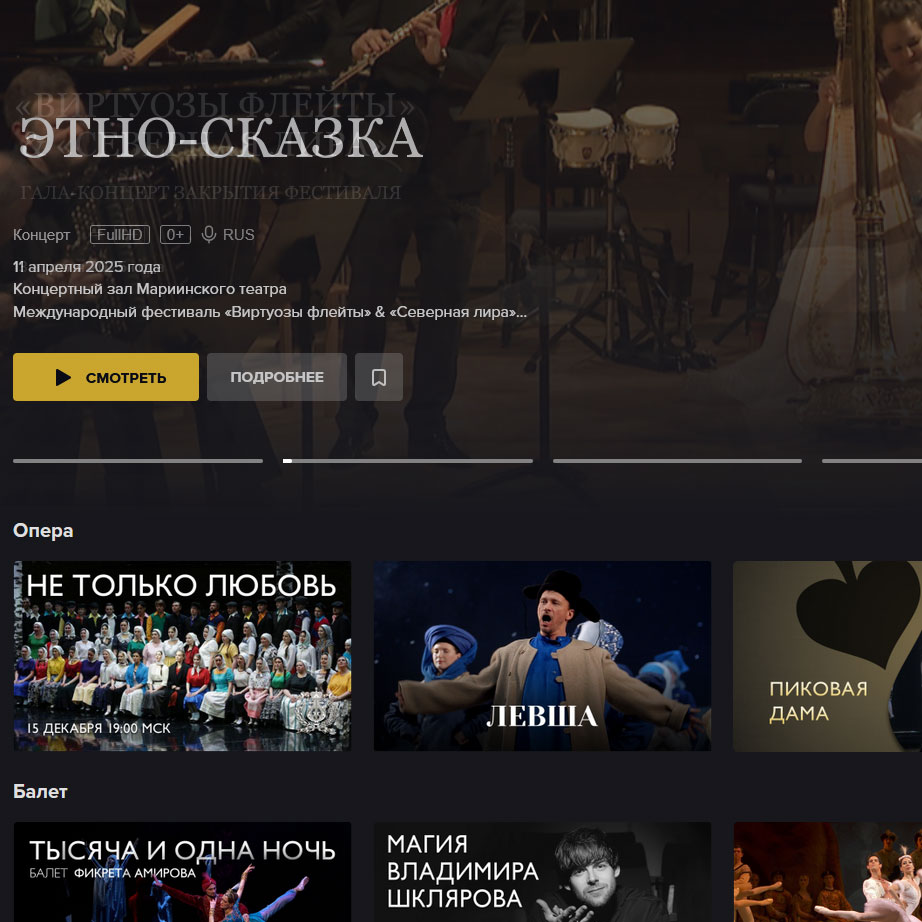 Ряд ресурсов предоставляют доступ к онлайн трансляциям спектаклей, концертов, осмотру экспозиций музеев, кинопоказам и пр. Эта подборка может быть полезна руководителям и методистам русских центров, партнерам фонда для организации образовательных и просветительских мероприятий на своих площадках.